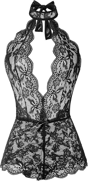 Women One Piece Black Lace sexy Lingerie Teddy, Halter Neckline, Bow Accents