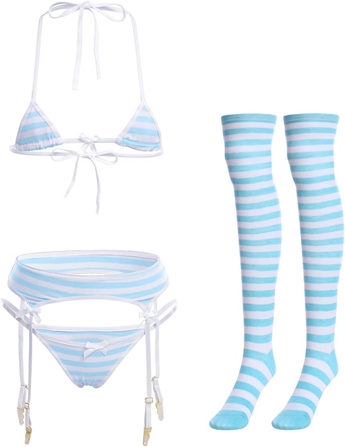 Women Cute Kawaii Anime Lingerie set Halter Strap Micro Bra Tiny Panty Garter Belt Striped Stockings 4Pcs Underwear