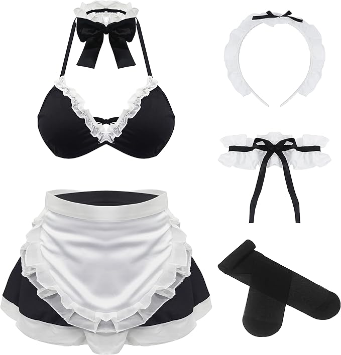 Lingerie Set for Women Ruffle French Maid Outfit with Headpiece Halloween Cosplay Lingerie Set 6 Pack Maid Costume