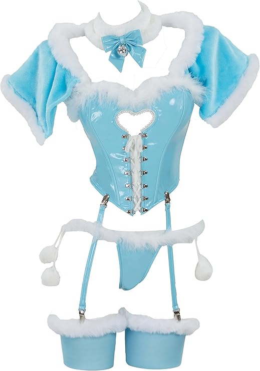 Women Sexy Lingerie Set Plush Blue Cosplay Sexy Costume Fluffy Heart Cutout Top and Thong with Cape